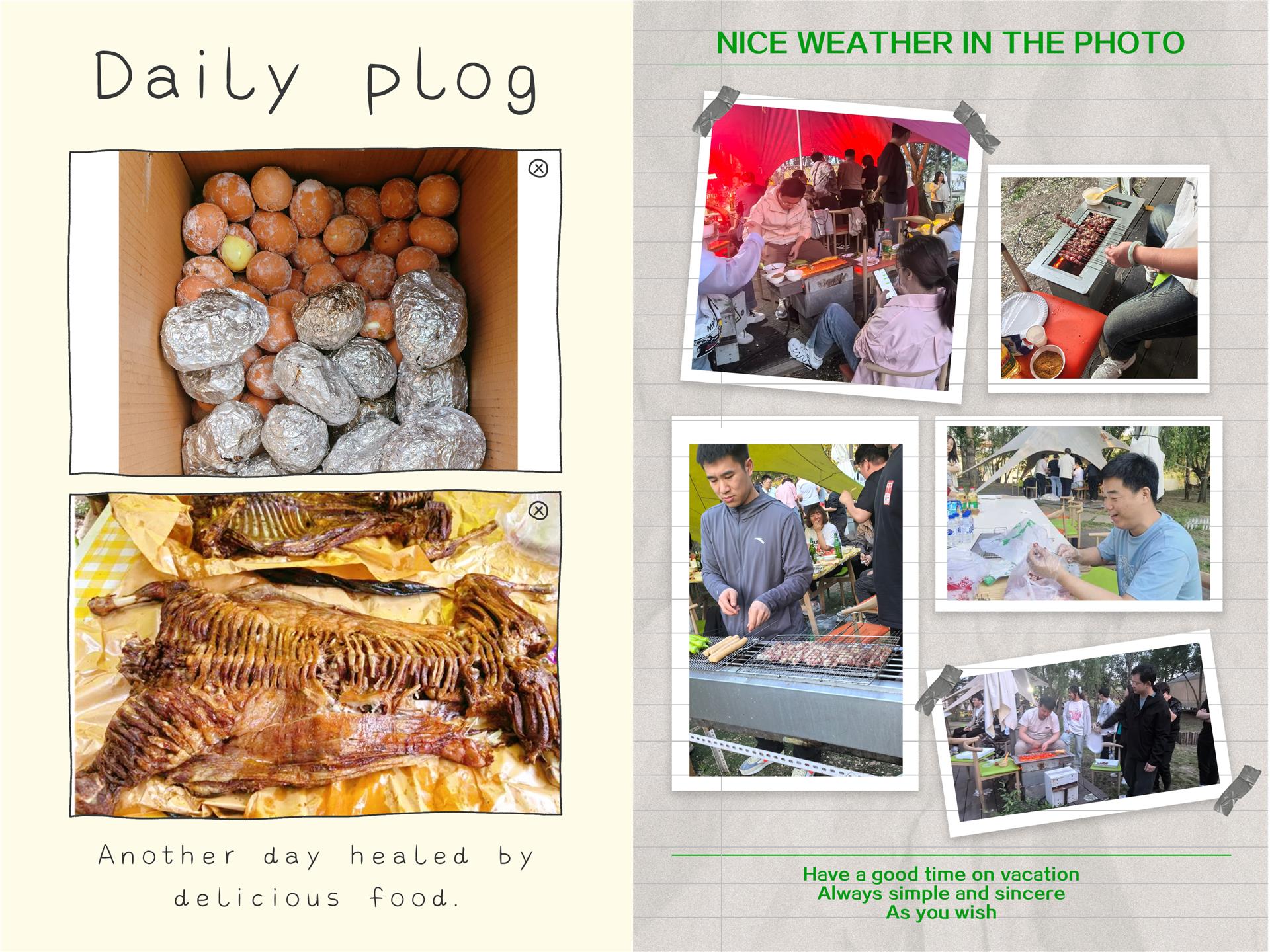 本次活動的重頭戲無疑是令人垂涎的烤全羊!當烤制完成的整羊被隆重抬出,現場響起一片歡呼。大家有序排隊,分享這外焦里嫩、鮮美多汁的美味,大快朵頤間,工作的疲憊一掃而空,臉上洋溢著滿足的笑容。與此同時,各部門的”串串兒能手”“燒烤大師”們也紛紛在各自的烤爐前大顯身手,烤制各類肉串、蔬菜等,煙火氣中傳遞著分享的樂趣。